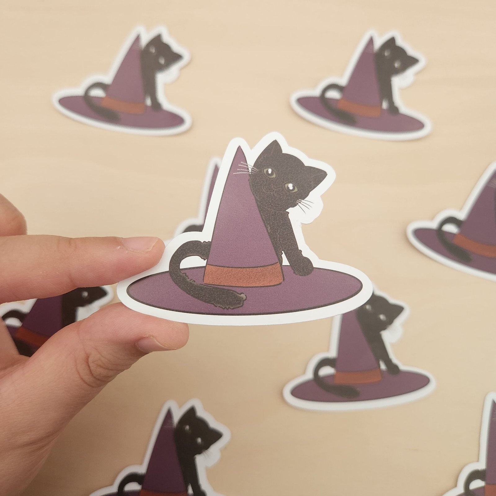 Halloween arrive et le petit chat sort de son chapeau pour essayer de t’effrayer. Cet autocollant est parfait pour décorer tes carnets ou tes objets préférés pour te mettre dans l’ambiance.
