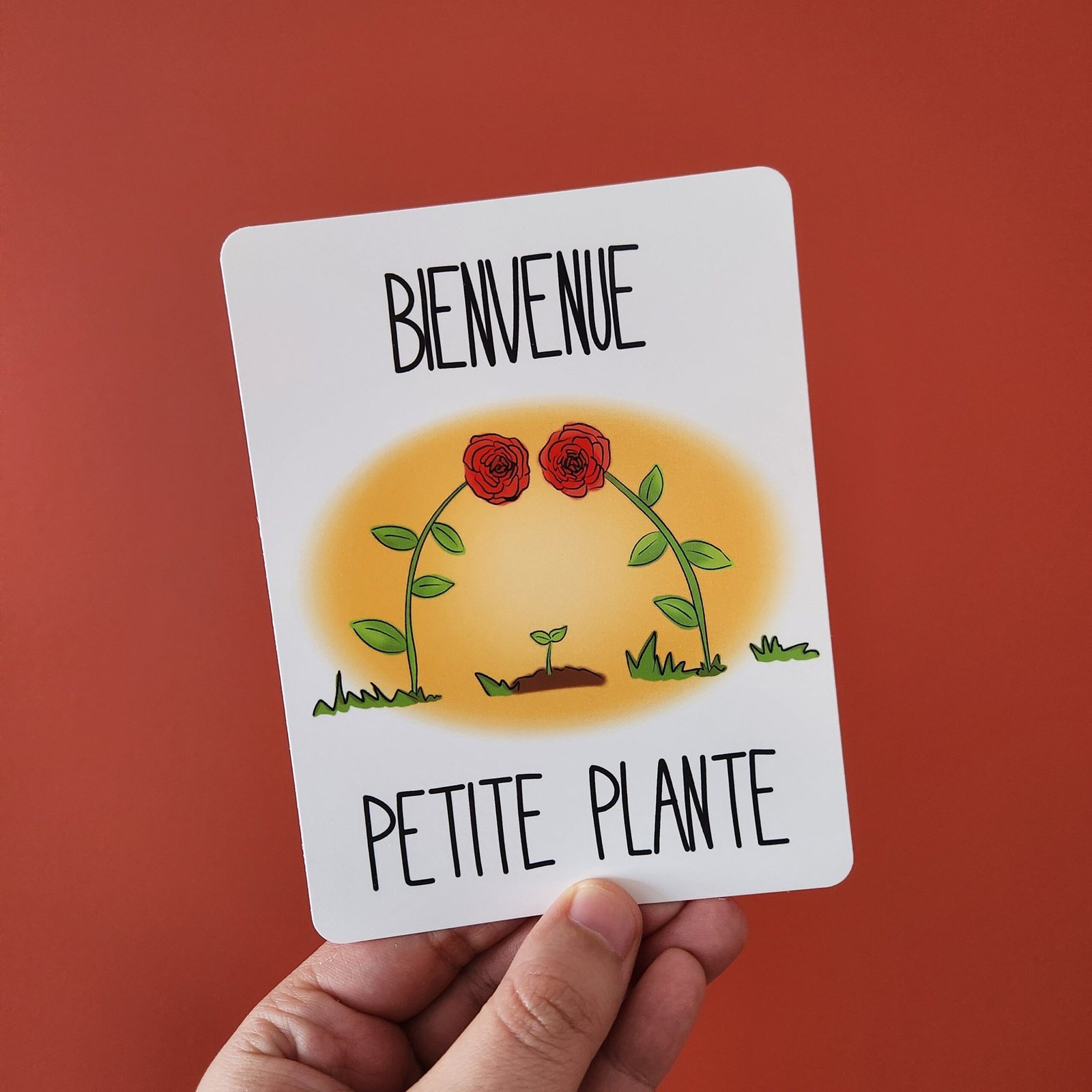 Accueille une petite pousse dans le monde avec cette douce carte « Bienvenue petite plante » 🌱 Célébre une nouvelle vie avec ce charmant motif représentant deux roses en fleurs et une petite pousse verte émergeant de la terre – un symbole poétique de croissance, d’amour et de nouveaux départs.